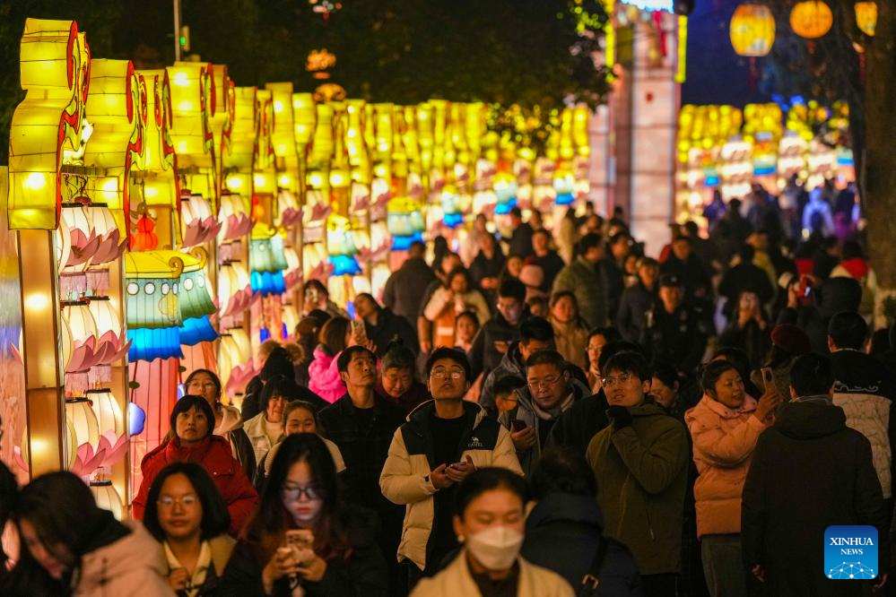 People enjoy lanterns at Bailuzhou Park in Nanjing, east China's Jiangsu Province, Feb. 12, 2025. Various activities were held across China to celebrate the Lantern Festival, which falls on the fifteenth day of the first month of the Chinese lunar calendar. (Xinhua/Li Bo)