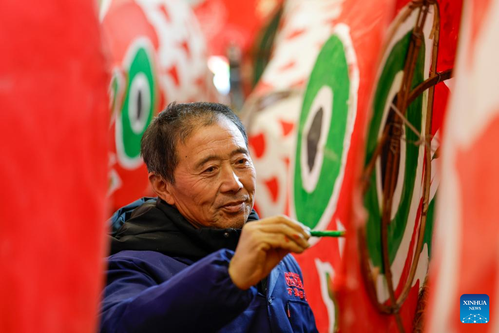 A villager practices drumming in Wangmantian Village of Xitou Town in Shexian County, Huangshan City of east China's Anhui Province, Feb. 10, 2025. Local villagers have the tradition to make fish-shaped lanterns to pray for harvest and good fortune and parade with them cheerfully around the Lantern Festival, which falls on the 15th day of the first month of the Chinese lunar calendar, or Feb. 12 this year. (Xinhua/Zhang Duan)