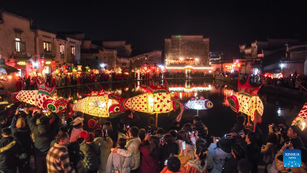Villagers parade with fish-shaped lanterns in Wangmantian Village of Xitou Town in Shexian County, Huangshan City of east China's Anhui Province, Feb. 10, 2025. Local villagers have the tradition to make fish-shaped lanterns to pray for harvest and good fortune and parade with them cheerfully around the Lantern Festival, which falls on the 15th day of the first month of the Chinese lunar calendar, or Feb. 12 this year. (Photo by Shi Yalei/Xinhua)