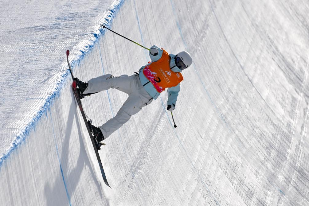 Li Fanghui of China competes during the women's freestyle skiing halfpipe final at the 9th Asian Winter Games in Yabuli, northeast China's Heilongjiang Province, Feb. 8, 2025. (Xinhua/Yang Chenguang)