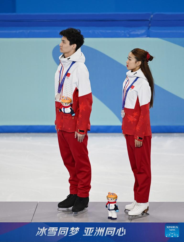 Silver medalists Ren Junfei (R)/Xing Jianing of China attend the awarding ceremony for the ice dance of figure skating event at the 9th Asian Winter Games in Harbin, northeast China's Heilongjiang Province, Feb. 12, 2025. (Xinhua/Chen Zhenhai)