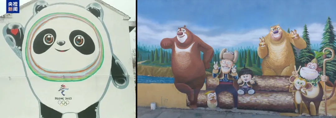 This combo photo shows murals featuring the 2022 Beijing Winter Olympic Games mascot Bing Dwen Dwen and beloved characters from the popular Chinese animated cartoon "Boonie Bears", respectively. The murals were created by Shen Jingyu on a wall in Shenjiacun village, Zhoucun district, Zibo city, east China's Shandong Province. (Photo/CCTV News)