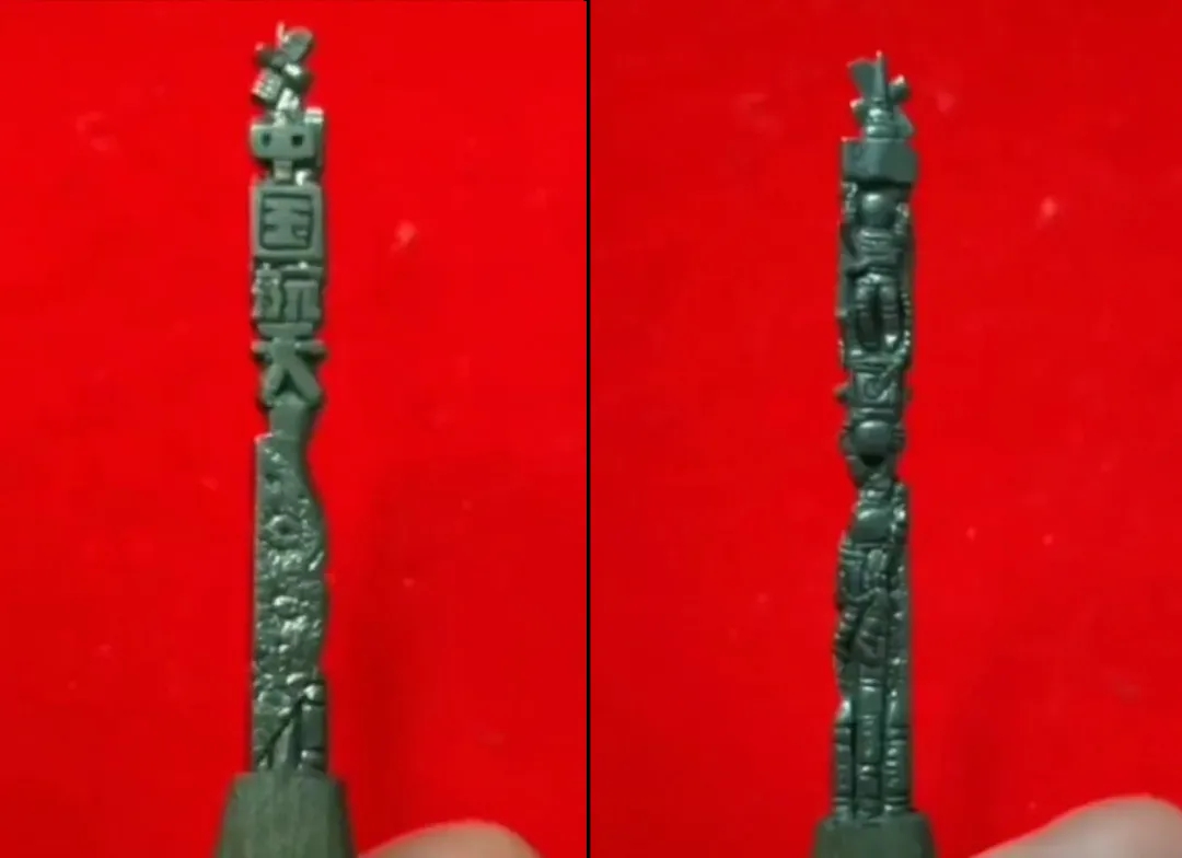 This combo photo shows the front and back of a micro-sculpture on a pencil tip created by Shen Jingyu. This intricate sculpture features elements of China's aerospace industry. (Photo/CCTV News)