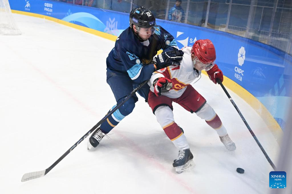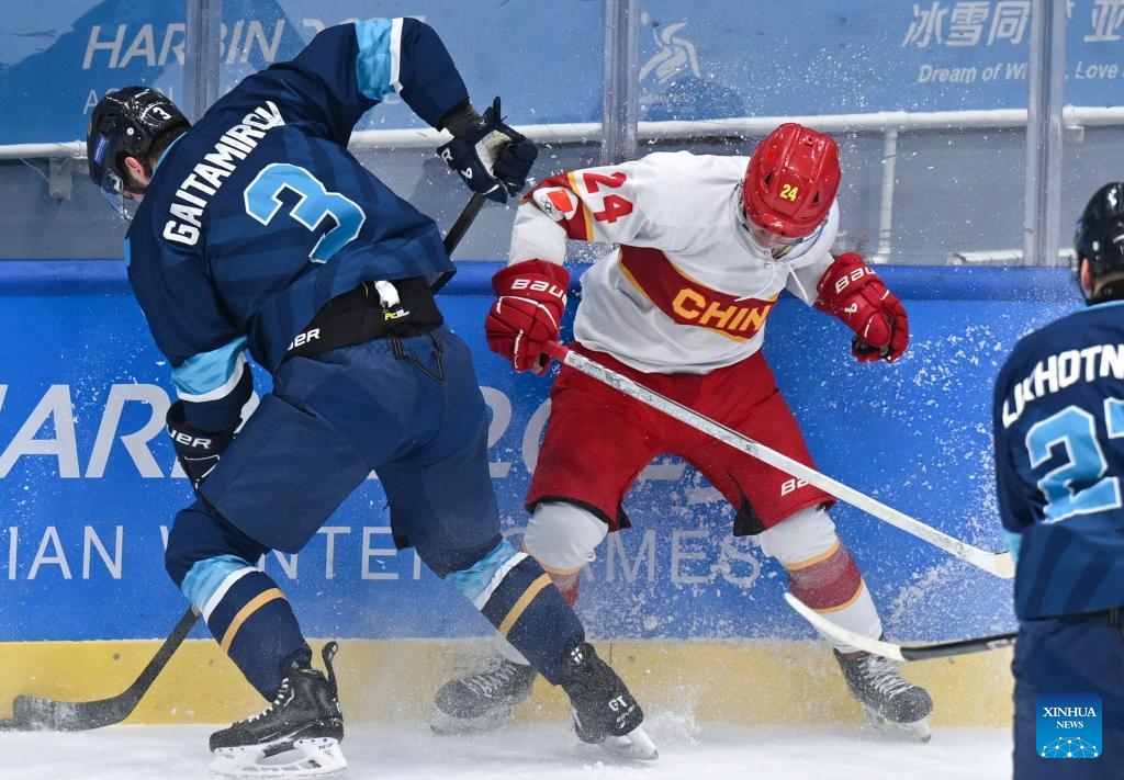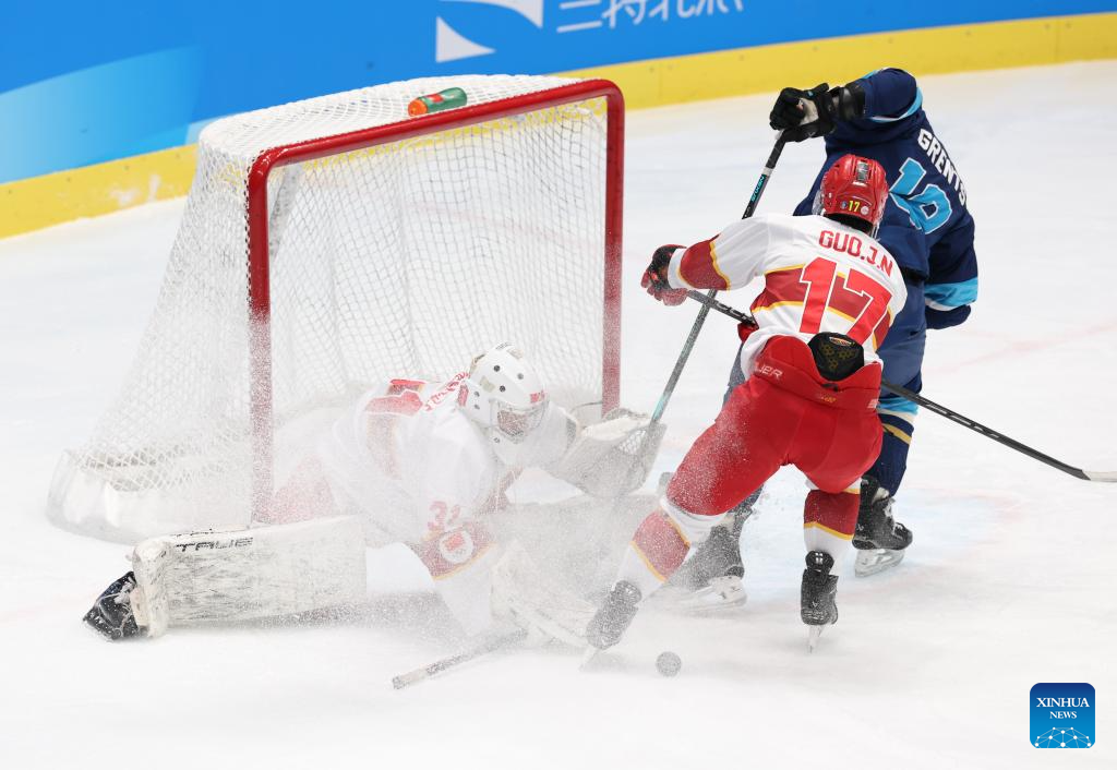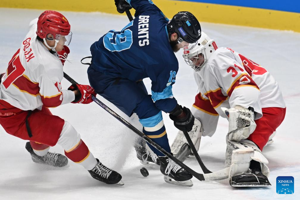 Dmitriy Grents (C) of Kazakhstan competes during the men's ice hockey play-offs semifinal match between Kazakhstan and China at 9th Asian Winter Games in Harbin, northeast China's Heilongjiang Province, on Feb. 13, 2025. (Xinhua/Li Ziheng)