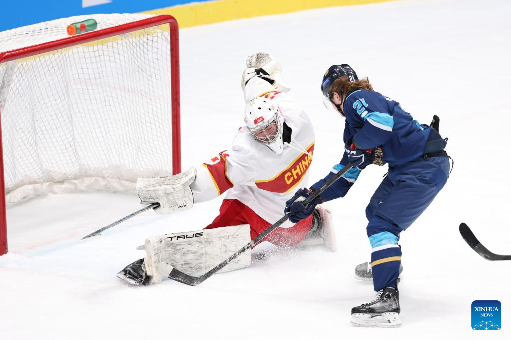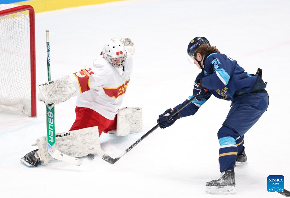 Vyacheslav Kolesnikov (R) of Kazakhstan shoots during the men's ice hockey play-offs semifinal match between Kazakhstan and China at 9th Asian Winter Games in Harbin, northeast China's Heilongjiang Province, on Feb. 13, 2025. (Xinhua/Yang Lei)