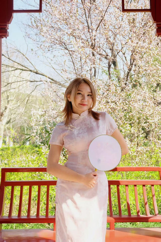 Tomiris Yelshibek experiences traditional Chinese culture by dressing in a cheongsam or qipao, a traditional garment for Chinese women. (Photo provided by Tomiris Yelshibek)