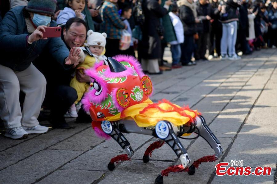 Robot dogs, with lion head-shaped decorations, perform dance alongside traditional lion dancers during a Lantern Festival celebration in Jinan, central China's Shandong Province, Feb. 12, 2025. (China News Service/Zhang Yong)