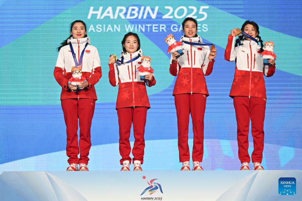 Tang Jialin, Wen Ying, Chu Yuanmeng and Meng Fanqi (L to R) of China celebrate at the victory ceremony for Biathlon women's 4x6km relay at the 9th Asian Winter Games in Harbin, northeast China's Heilongjiang Province, Feb. 13, 2025. (Xinhua/Lian Zhen)