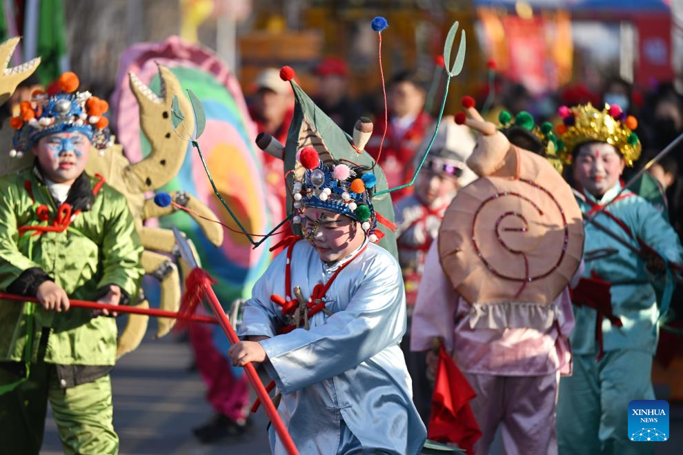 People perform during a memorial ceremony for Chinese sea goddess Mazu in north China's Tianjin Municipality, Feb. 13, 2025. Gegu Baonianhui, a memorial ceremony for Chinese sea goddess Mazu observed in Gegu Township, was staged on Thursday in Tianjin. This memorial ceremony was included in national intangible cultural heritage list in 2014. It is an important activity for the locals to celebrate the Chinese New Year and pray for good luck. (Xinhua/Li Ran)