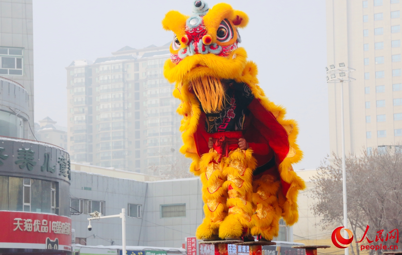 Photo shows a lion dance performance during a Shehuo parade in Changji city, Changji Hui Autonomous Prefecture, northwest China's Xinjiang Uygur Autonomous Region on Feb. 12, 2025. (People's Daily Online/Li Long)