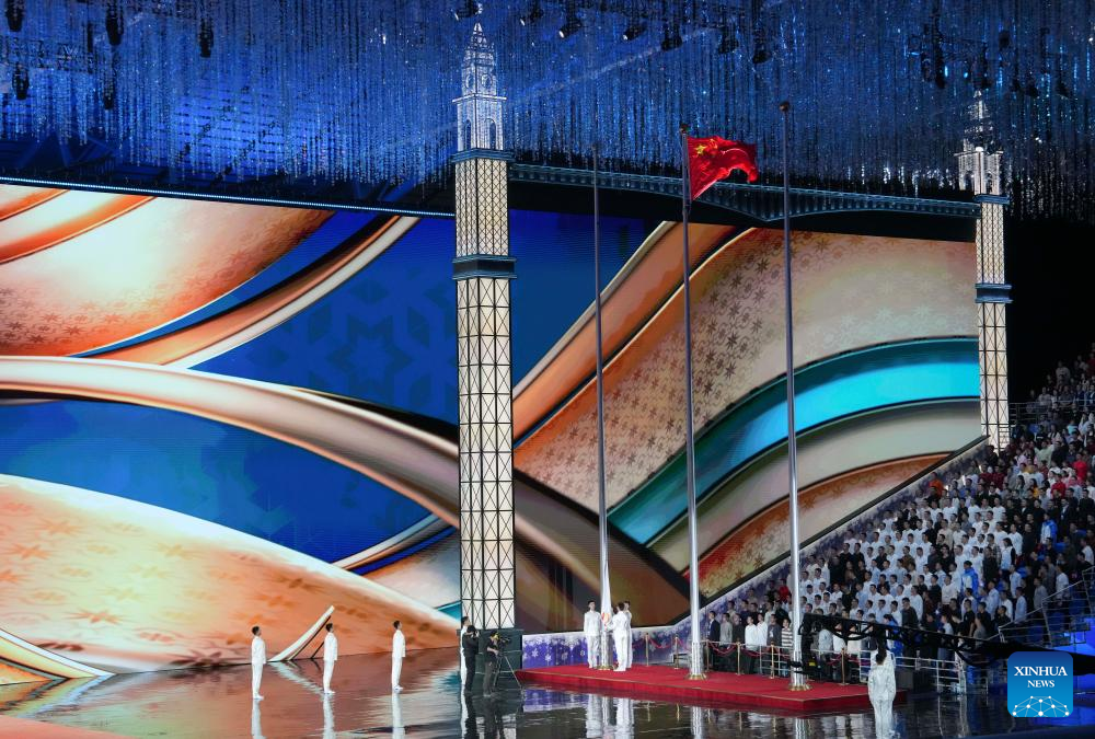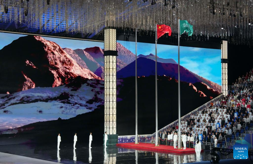 The Chinese national flag and the Saudi Arabia flag are seen during the closing ceremony of the 9th Asian Winter Games in Harbin, northeast China's Heilongjiang Province, Feb. 14, 2025. (Xinhua/Wang Jianwei)