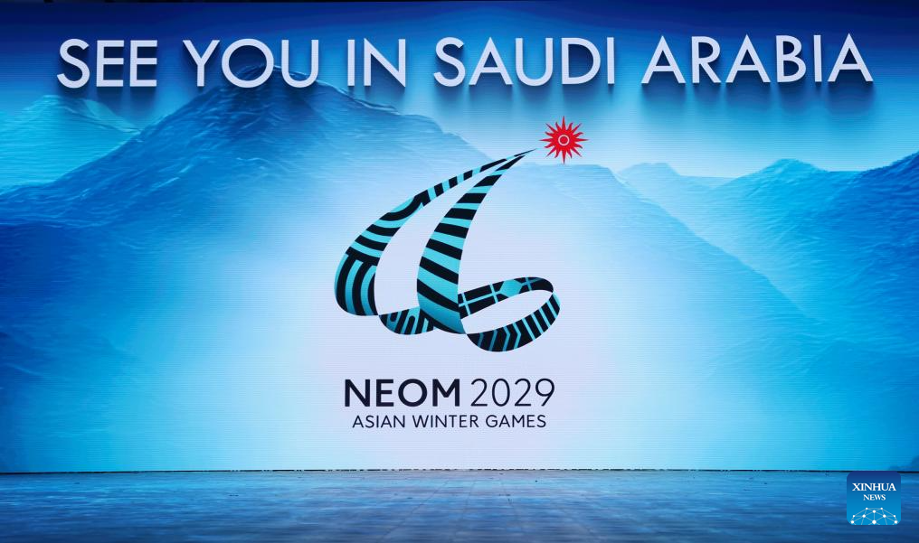 A screen showing the name and sign of the 10th Asian Winter Games host city Neom of Saudi Arabia is seen during the closing ceremony of the 9th Asian Winter Games in Harbin, northeast China's Heilongjiang Province, Feb. 14, 2025. (Xinhua/Xu Yanan)