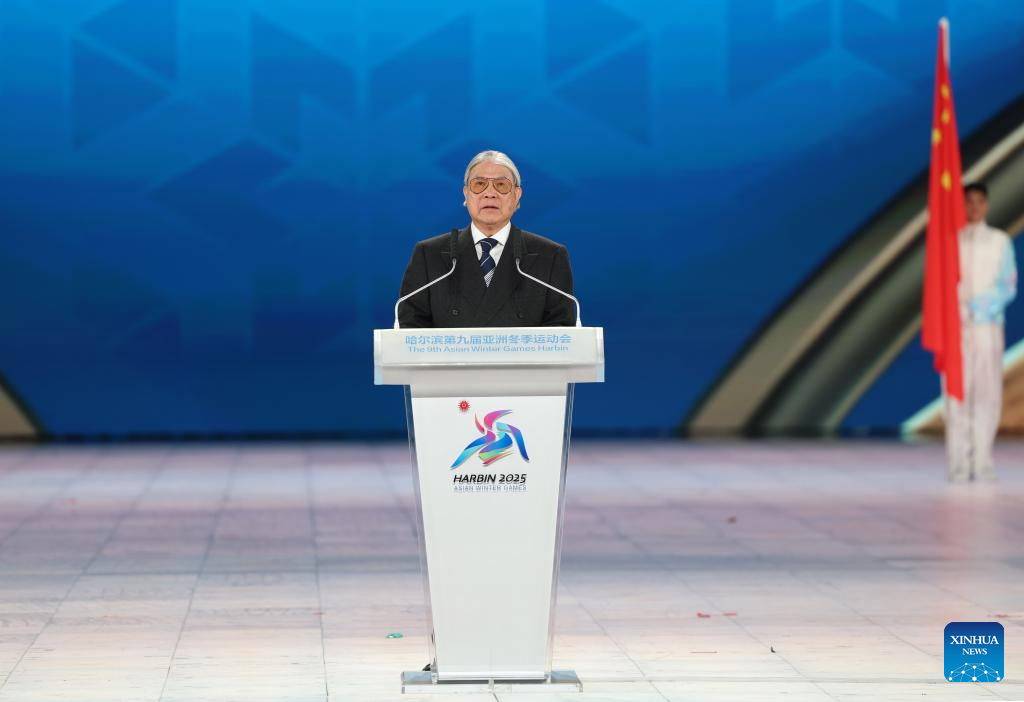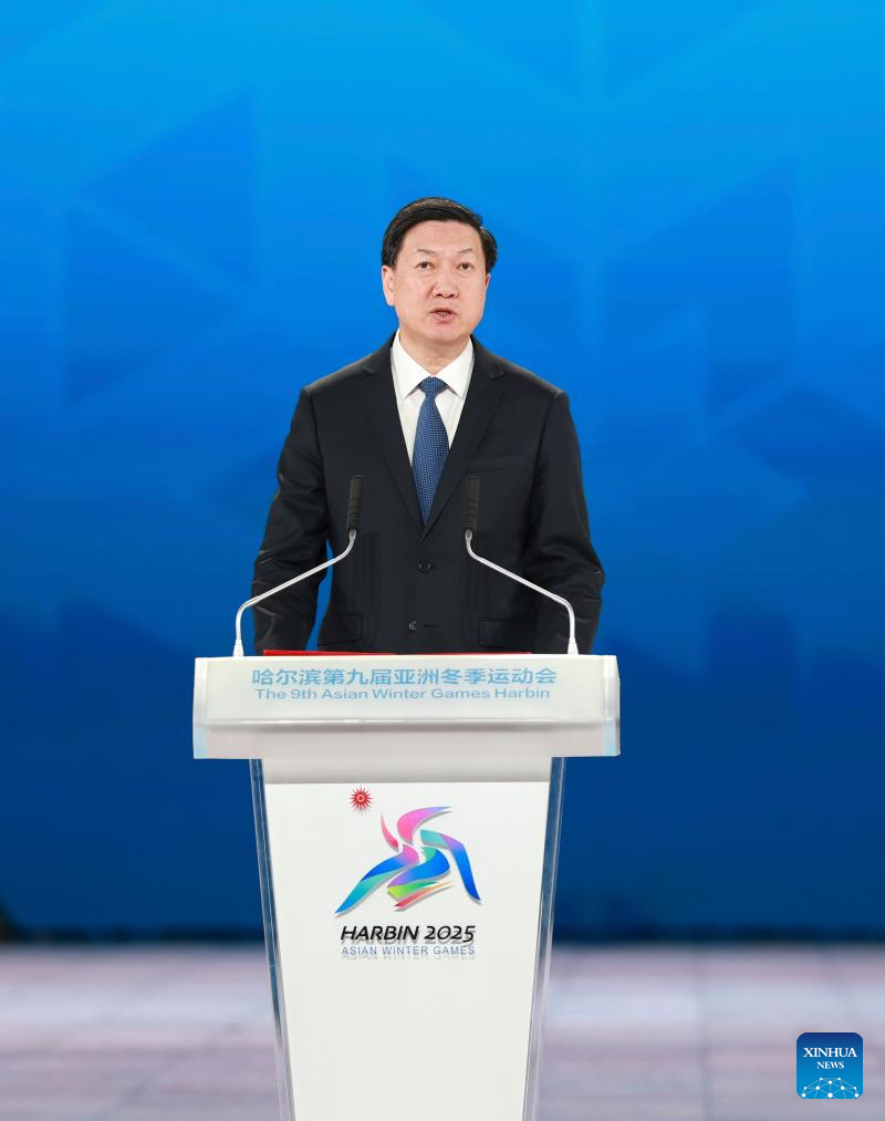 Gao Zhidan (C), president of the 9th Asian Winter Games Harbin Organising Committee and the Chinese Olympic Committee, speaks during the closing ceremony of the 9th Asian Winter Games in Harbin, northeast China's Heilongjiang Province, Feb. 14, 2025. (Xinhua/Chen Yichen)
