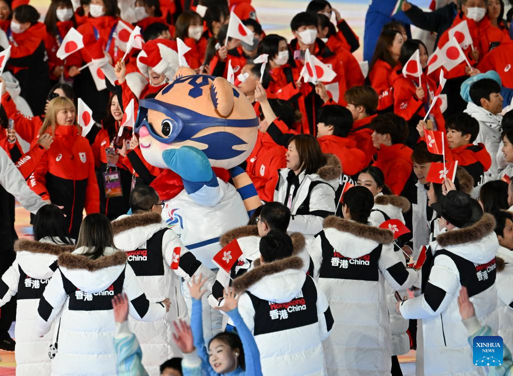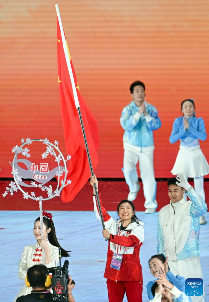 Freestyle skier and Olympic champion Xu Mengtao, who secured two gold medals and a silver in Harbin, carried the flag for the Chinese delegation during the closing ceremony.