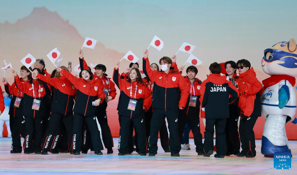 Members of Japanese delegation attend the closing ceremony of the 9th Asian Winter Games in Harbin, northeast China's Heilongjiang Province, Feb. 14, 2025. (Xinhua/Xu Yanan)