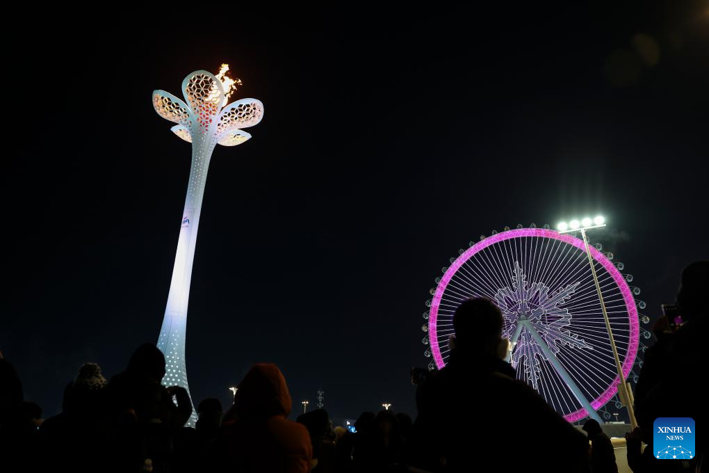 The cauldron is seen at Harbin Ice and Snow World Park during the closing ceremony of the 9th Asian Winter Games in Harbin, northeast China's Heilongjiang Province, Feb. 14, 2025. (Xinhua/Huang Wei)