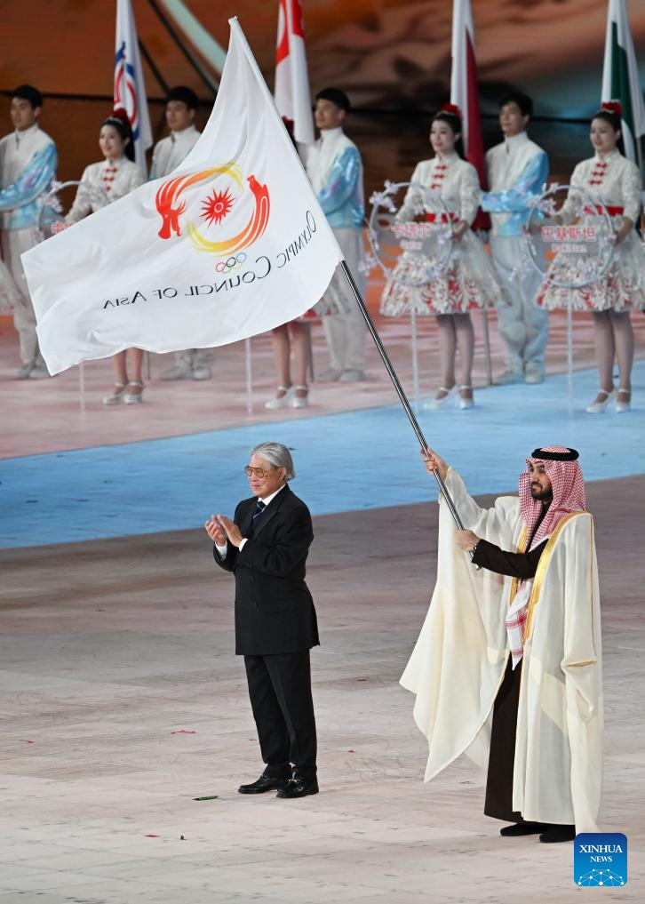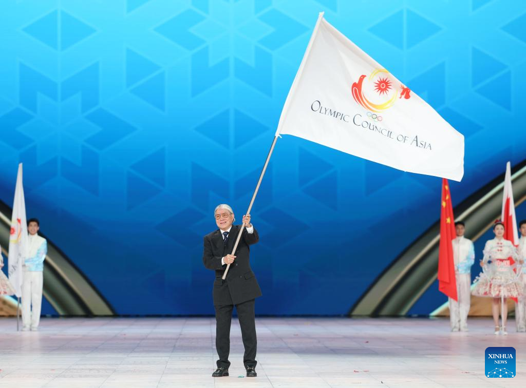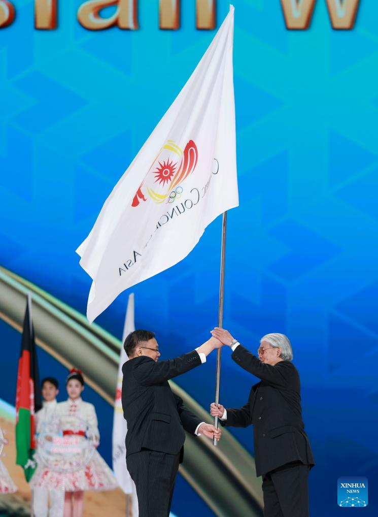 The Olympic Council of Asia (OCA) flag handover ceremony is seen during the closing ceremony of the 9th Asian Winter Games in Harbin, northeast China's Heilongjiang Province, Feb. 14, 2025. (Xinhua/Wang Jianwei)
