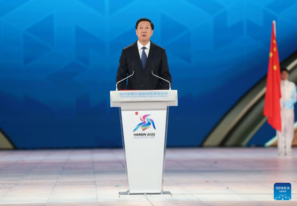 Chinese Premier Li Qiang attends the closing ceremony of the 9th Asian Winter Games in Harbin, northeast China's Heilongjiang Province, Feb. 14, 2025. (Xinhua/Ding Haitao)