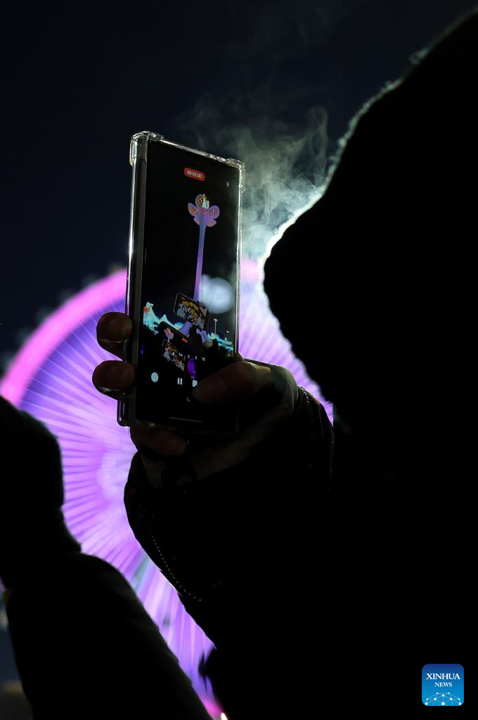 A tourist records the extinguishing of the cauldron at Harbin Ice and Snow World Park during the closing ceremony of the 9th Asian Winter Games in Harbin, northeast China's Heilongjiang Province, Feb. 14, 2025. (Xinhua/Huang Wei)