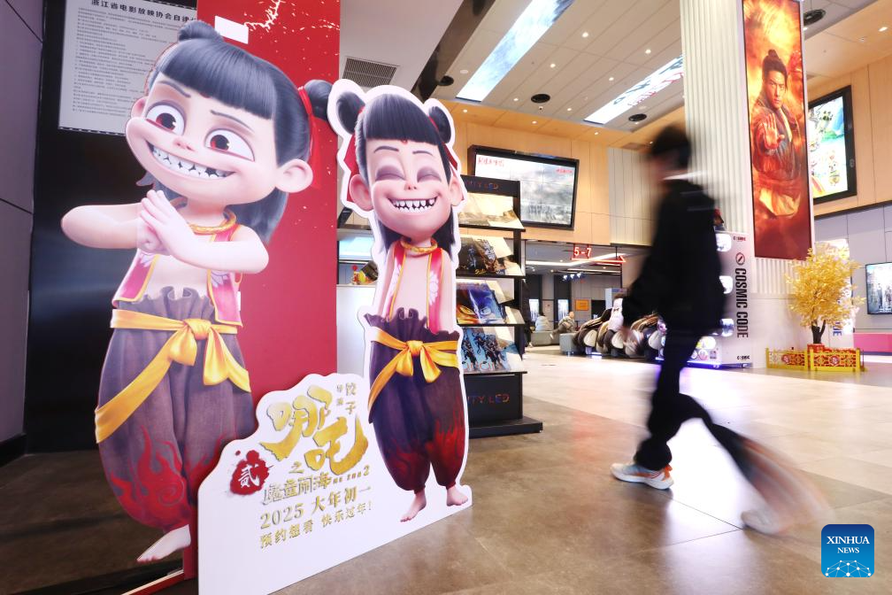 A moviegoer walks past film posters at a cinema in Jiaxing City, east China's Zhejiang Province, Feb. 3, 2025.(Photo by Jin Peng/Xinhua)