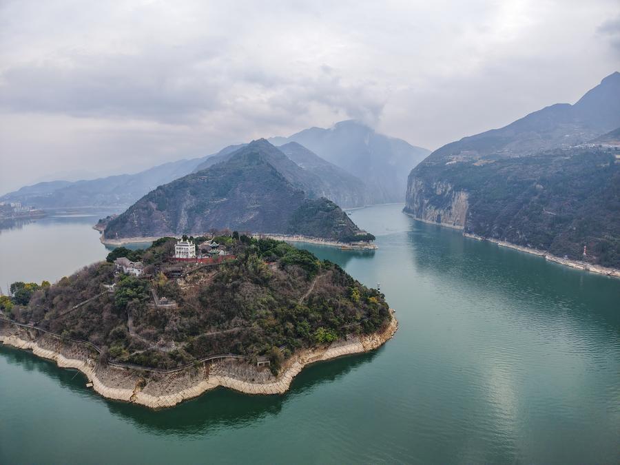 An aerial drone photo taken on Feb. 13, 2025 shows the scenery around the ancient town of Baidi and Qutang Gorge, one of the Three Gorges on the Yangtze River, in Fengjie County, southwest China's Chongqing Municipality. (Photo by Zhu Song/Xinhua)