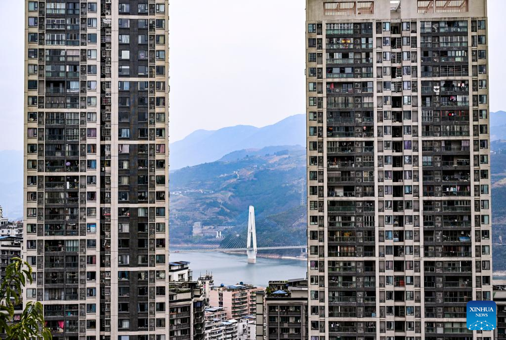 This photo taken on Feb. 12, 2025 shows downtown buildings and the Kuimen bridge crossing the Yangtze River in Fengjie County, southwest China's Chongqing Municipality. Fengjie, a county in Chongqing where the Kuimen gateway to the magnificent gorges of the Yangtze River is located, gained its reputation as the "city of poetry," as poets, military figures and politicians in history wrote extensively about the forbidding landscape of rapid currents and narrow waterways.