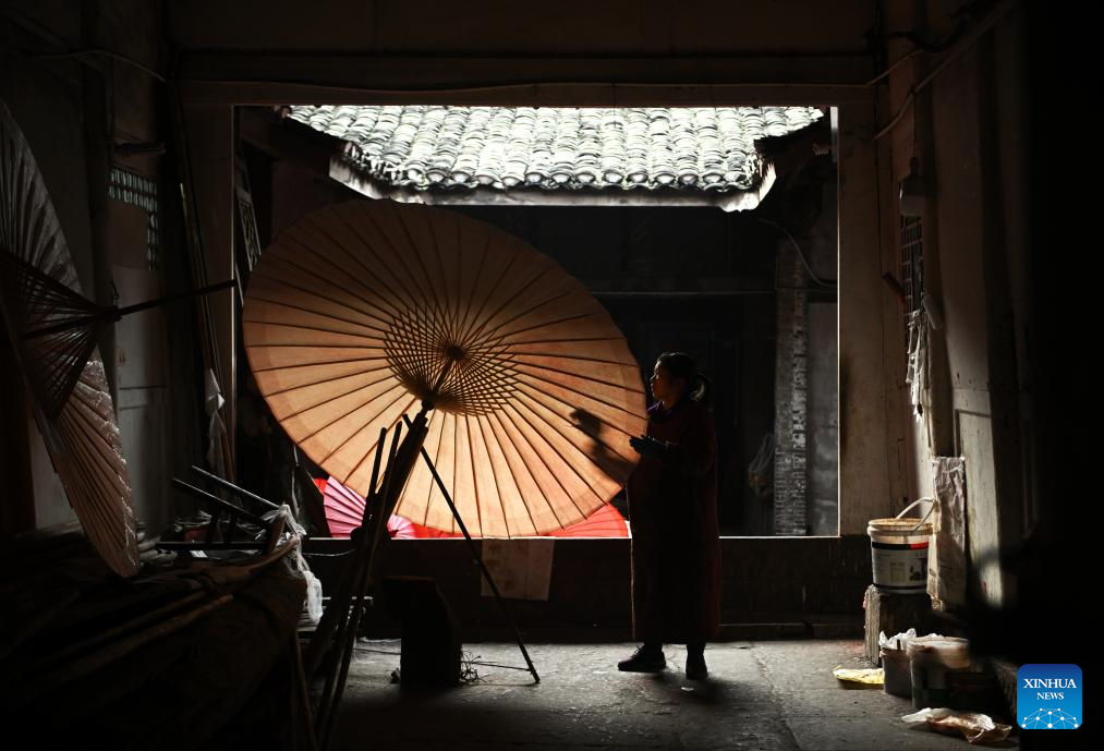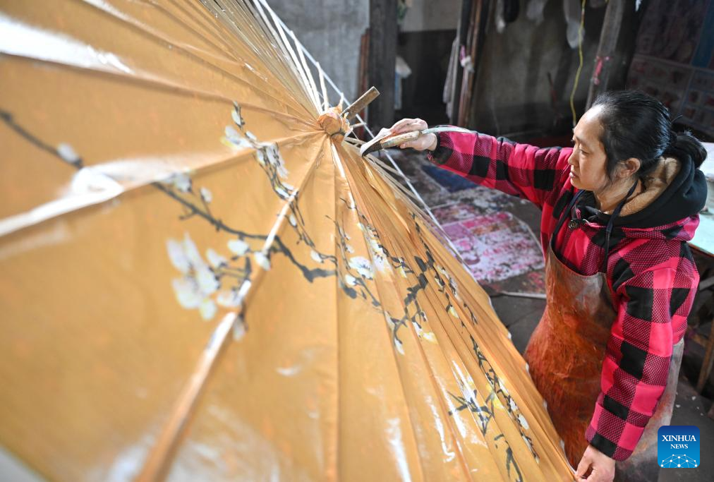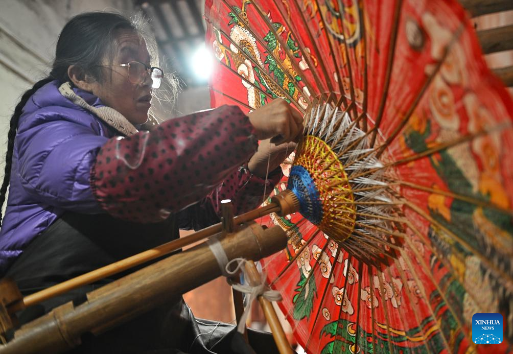 A craftswoman makes an oil-paper umbrella in Fenshuiling Town of Luzhou City, southwest China's Sichuan Province, Feb. 11, 2025. (Xinhua/Liu Kun)