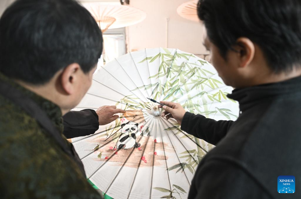 Bi Liufu (L) and his son Bi Yuanshen discuss on a pattern of an oil-paper umbrella in Fenshuiling Town of Luzhou City, southwest China's Sichuan Province, Feb. 11, 2025. (Xinhua/Liu Kun)