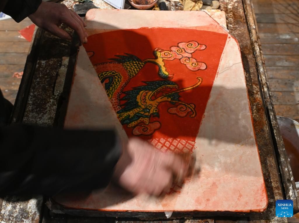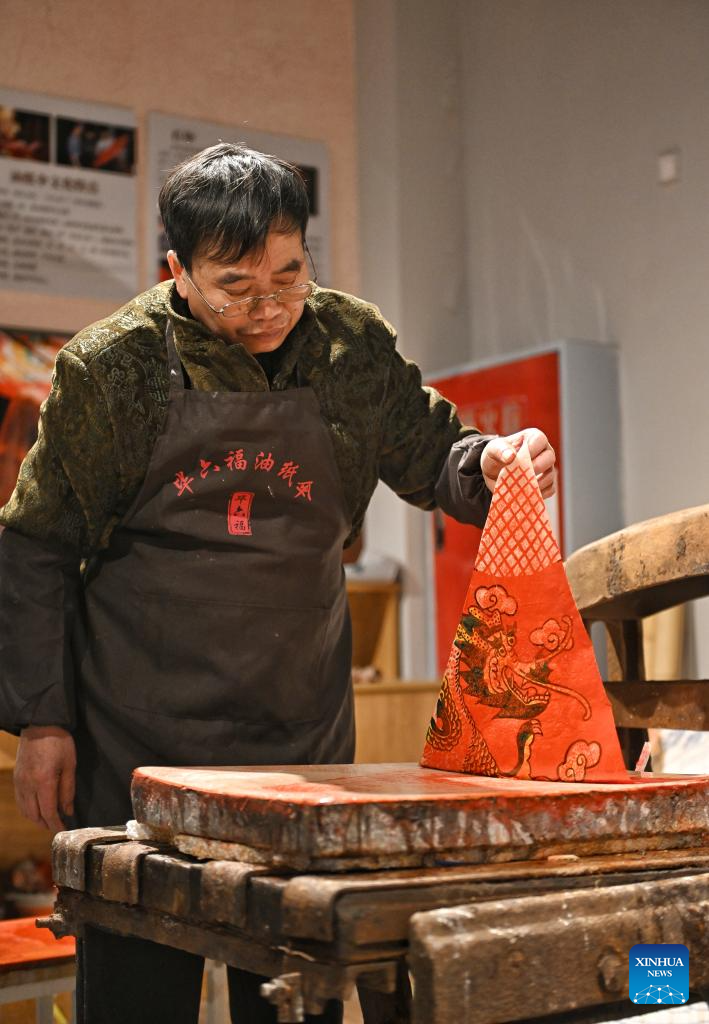 Bi Liufu prints a pattern of oil-paper umbrella with a stone plate in Fenshuiling Town of Luzhou City, southwest China's Sichuan Province, Feb. 11, 2025. (Xinhua/Liu Kun)