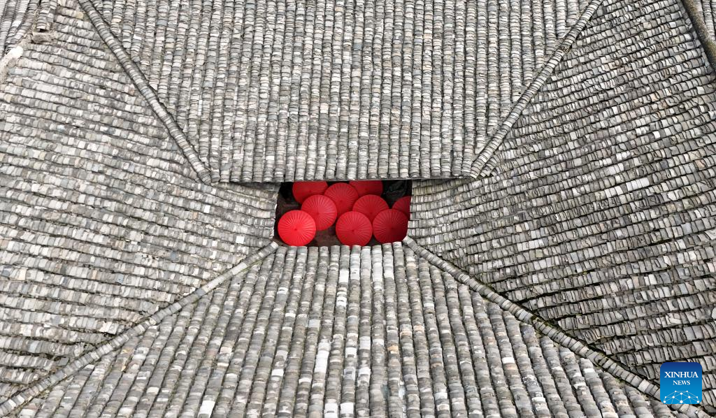 An aerial drone photo taken on Feb. 11, 2025 shows freshly made oil-paper umbrellas being aired in a yard in Fenshuiling Town of Luzhou City, southwest China's Sichuan Province. (Xinhua/Liu Kun)