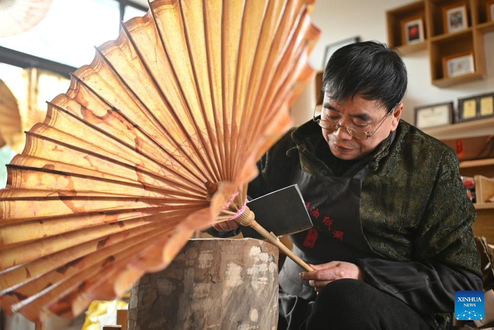 A craftswoman applies tung oil on the cover of an oil-paper umbrella in Fenshuiling Town of Luzhou City, southwest China's Sichuan Province, Feb. 11, 2025. (Xinhua/Liu Kun)