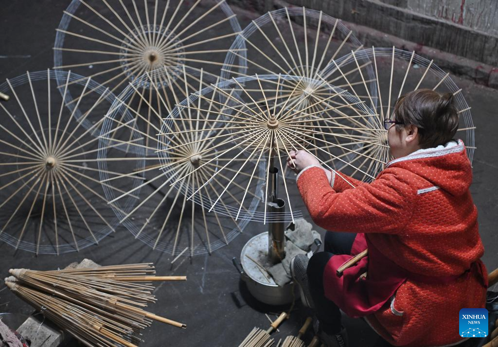 A craftswoman fabricates the frame of an oil-paper umbrella in Fenshuiling Town of Luzhou City, southwest China's Sichuan Province, Feb. 11, 2025. (Xinhua/Liu Kun)