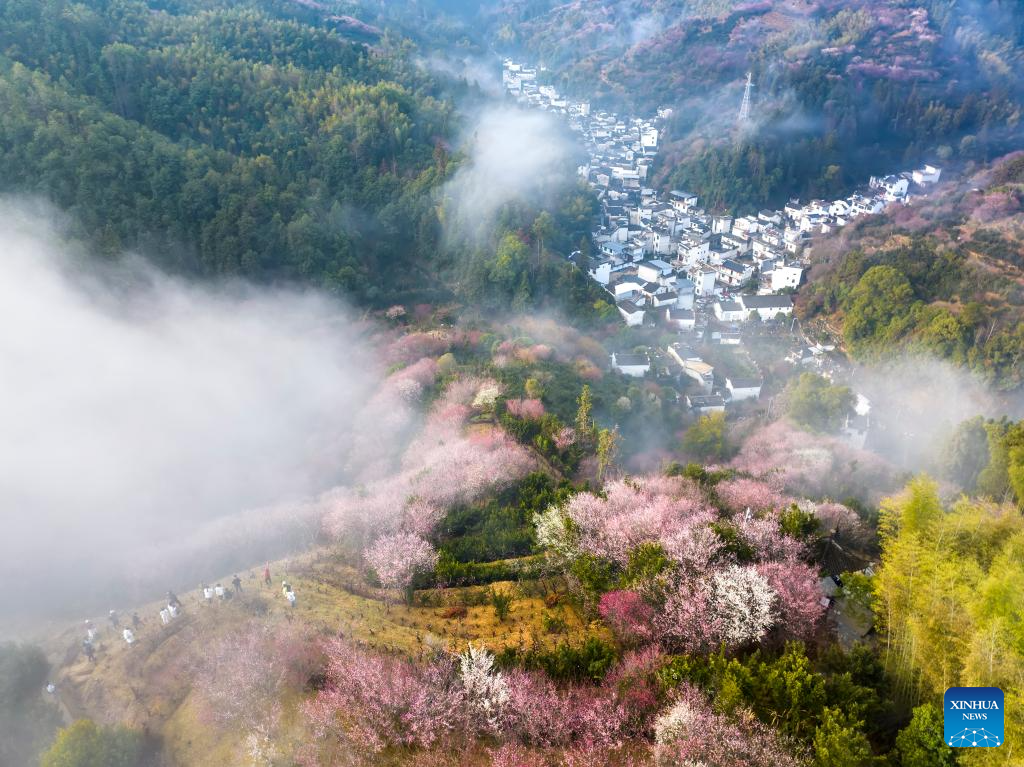 This aerial drone photo taken on Feb. 16, 2025 shows tourists enjoying plum blossoms at a village in Shexian County, Huangshan City, east China's Anhui Province. (Photo by Fan Chengzhu/Xinhua)
