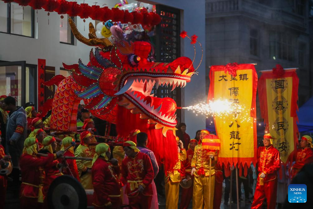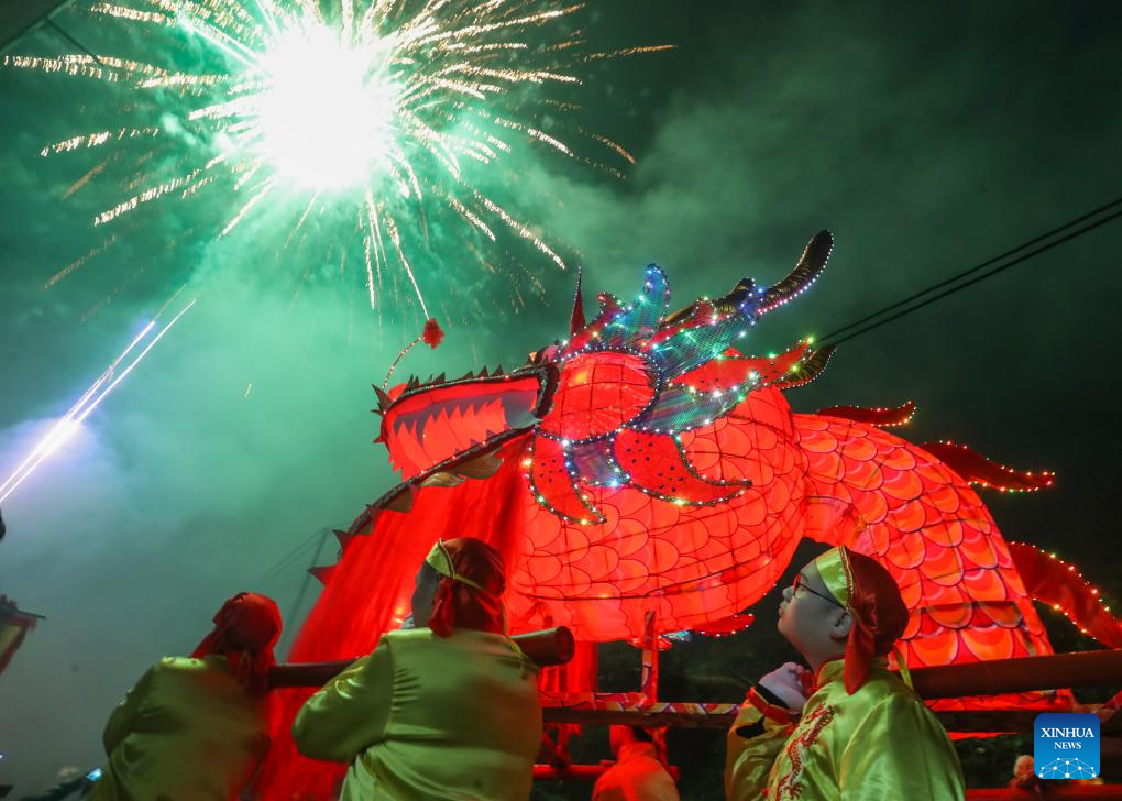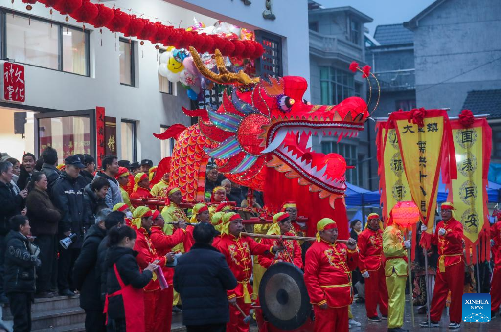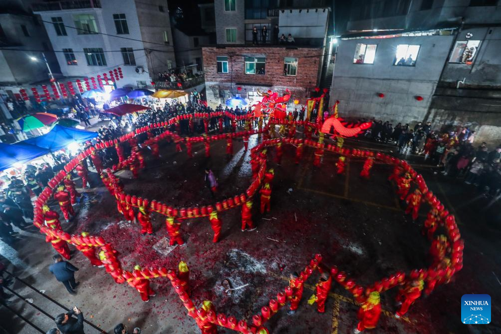 A dragon dance show is staged in Ruhong Village of Chun'an County, east China's Zhejiang Province, Feb. 15, 2025. The Lantern Festival falls on the 15th day of the first lunar month, marking the end of the Chinese New Year celebrations. However, in Ruhong Village, people watch opera performance, solve lantern riddles and perform dragon dance to celebrate the festival on the 18th day of the first lunar month. The tradition has been kept and now become a signature tourism attraction. (Xinhua/Xu Yu)