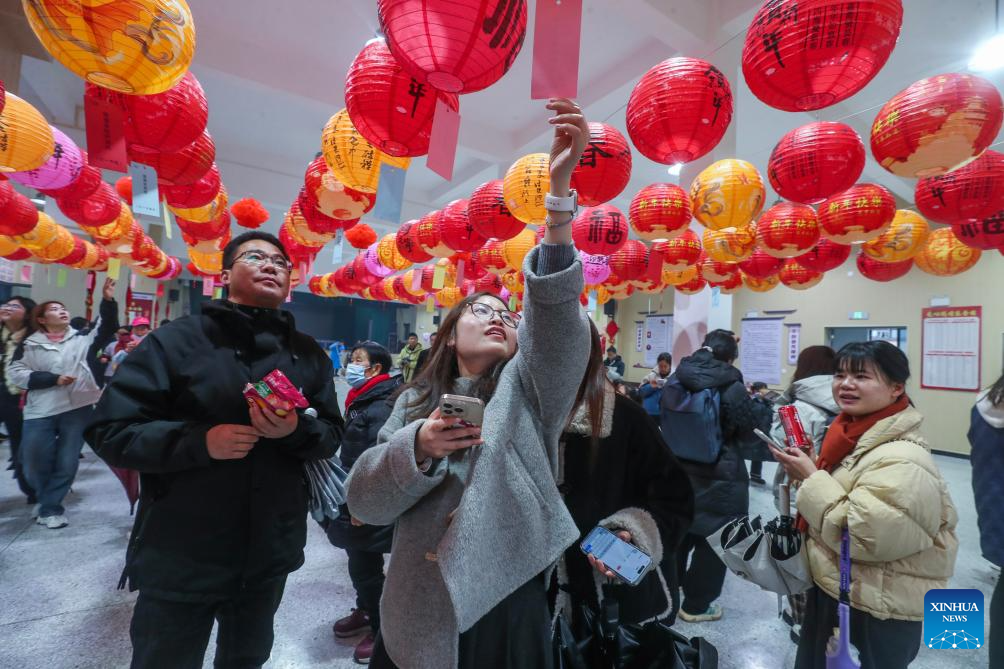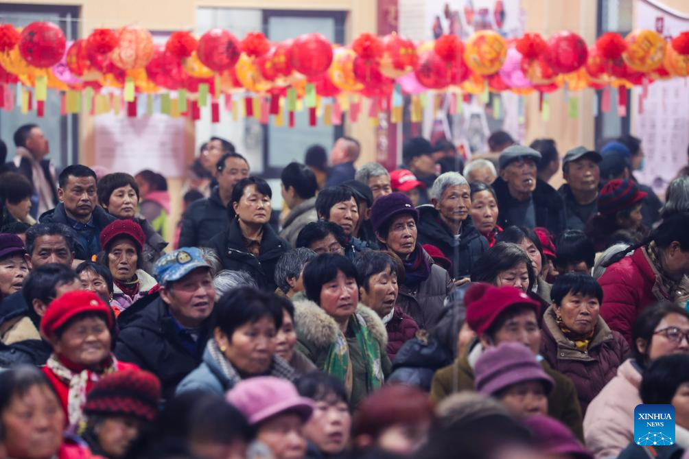 People solve lantern riddles in Ruhong Village of Chun'an County, east China's Zhejiang Province, Feb. 15, 2025. The Lantern Festival falls on the 15th day of the first lunar month, marking the end of the Chinese New Year celebrations. However, in Ruhong Village, people watch opera performance, solve lantern riddles and perform dragon dance to celebrate the festival on the 18th day of the first lunar month. The tradition has been kept and now become a signature tourism attraction. (Xinhua/Xu Yu)