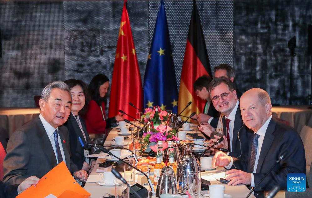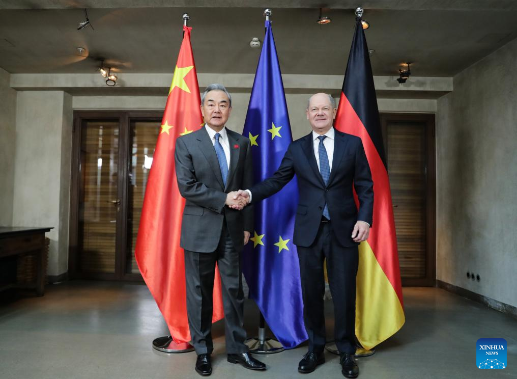 German Chancellor Olaf Scholz meets with Chinese Foreign Minister Wang Yi, who is also a member of the Political Bureau of the Communist Party of China Central Committee, in Munich, Germany, Feb. 15, 2025. (Xinhua/Zhang Fan)