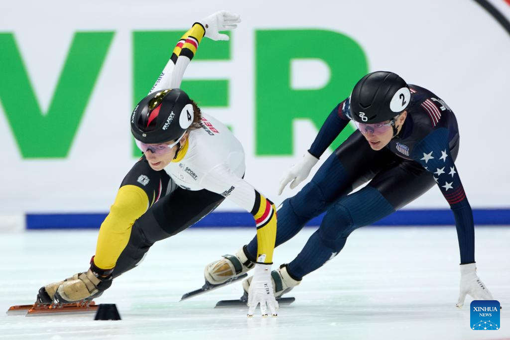 Hanne Desmet (L) of Belgium and Kristen Santos-Griswold of the United States compete during the women's 1500m final A at the ISU Short Track World Tour 2024/2025 in Milan, Italy, Feb. 16, 2025. (Xinhua/Meng Dingbo)