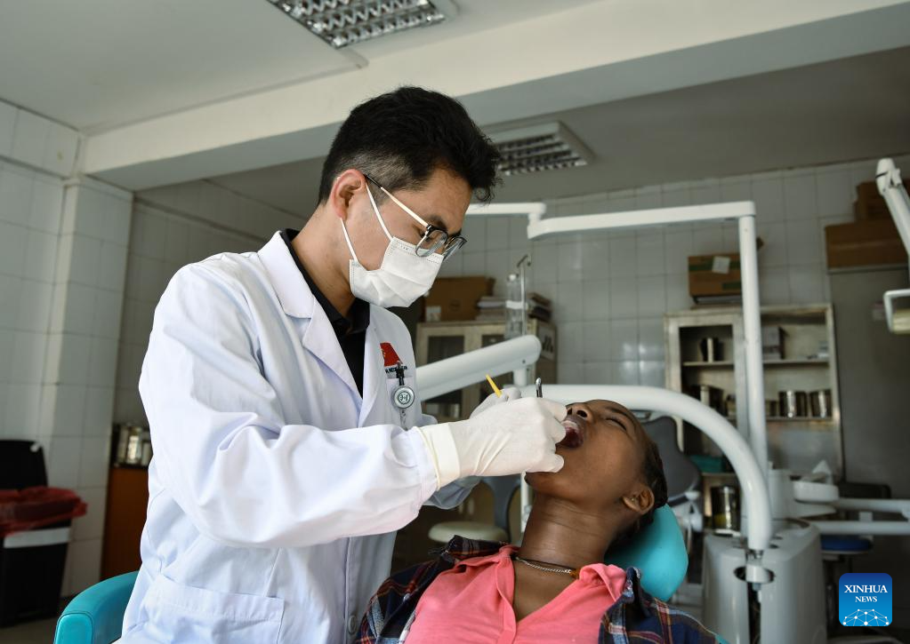 Chinese doctor Gao Chong, a member of the 25th Chinese medical team dispatched to Ethiopia, performs an oral examination for a patient at the Tirunesh Beijing General Hospital in Addis Ababa, Ethiopia, Feb. 14, 2025. The 25th Chinese medical team dispatched to Ethiopia arrived in the country in May 2024 and has been providing medical services for local patients and training for local doctors. The Tirunesh Beijing General Hospital was also built as part of long-standing assistance efforts of the Chinese government. (Xinhua/Han Xu)