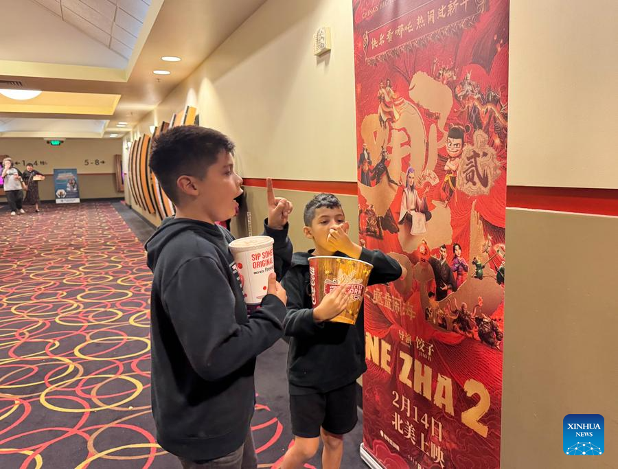 Children look at a poster for "Ne Zha 2" in a theater in Los Angeles County, the United States, Feb. 14, 2025. (Photo by Qiu Chen/Xinhua)