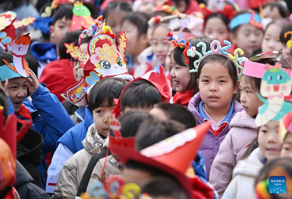 Students perform at the opening ceremony of the new semester at a primary school in north China's Tianjin Municipality, Feb. 17, 2025. The new semester for primary and secondary schools kicked off in many parts of China on Monday. (Xinhua/Li Ran)