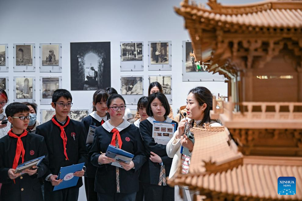 Middle school students learn about Chinese ancient architecture at an art museum in Shanghai, east China, Feb. 17, 2025. With a mixture of nerves and excitement, many students in China attended their special first class of new semester. (Photo by Chen Haoming/Xinhua)