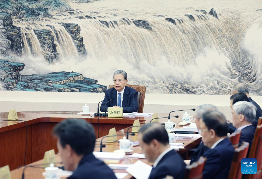 Zhao Leji, chairman of the National People's Congress (NPC) Standing Committee, presides over the 38th meeting of the Council of Chairpersons of the 14th NPC Standing Committee at the Great Hall of the People in Beijing, capital of China, Feb. 17, 2025. (Xinhua/Yao Dawei)