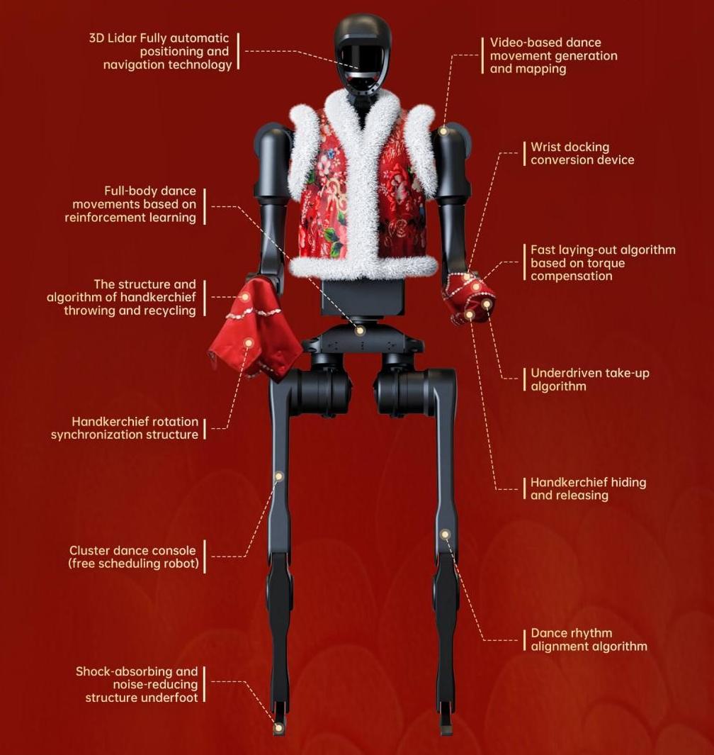 At China Central Television Station's 2025 Spring Festival Gala, 16 humanoid robots named "Fuxi" from Unitree Robotics performed Yangko folk dance on the stage, dressed in northeastern Chinese style floral cotton-padded jackets and twirling handkerchiefs. They soon went viral on social media.
