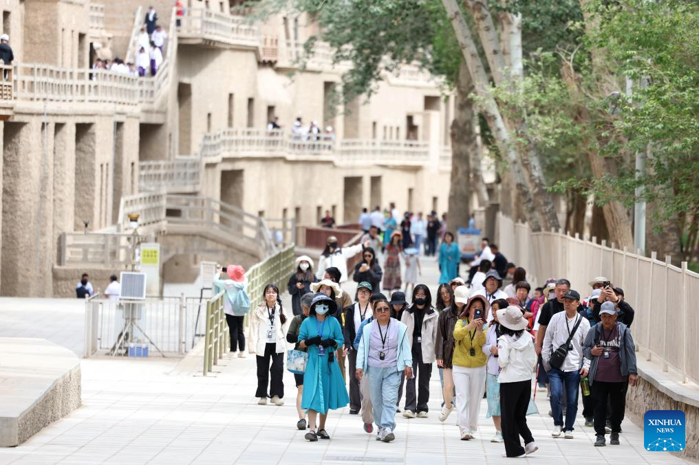 Tourists visit the Mogao Caves in Dunhuang, northwest China's Gansu Province, June 7, 2024. Around 2,000 years ago, Dunhuang was a key hub on the ancient Silk Road. Chinese silk and tea passed through this gateway en route to other countries, while agricultural products such as grapes, carrots and pomegranates made their way into China.
