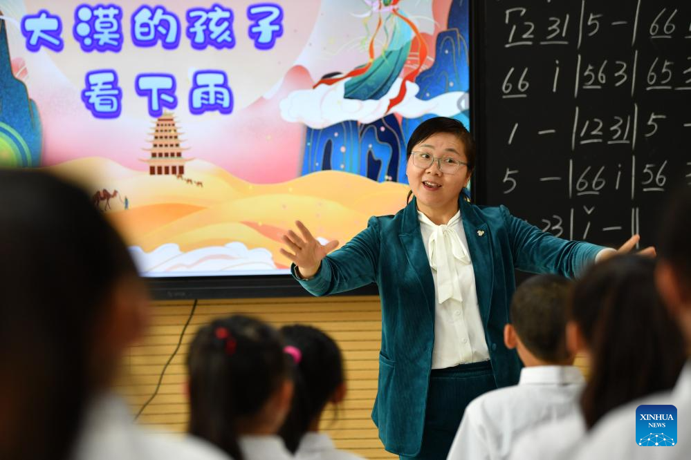 A teacher guides students to sing a song with characteristics of Dunhuang at a primary school in Dunhuang, northwest China's Gansu Province, April 26, 2023. Around 2,000 years ago, Dunhuang was a key hub on the ancient Silk Road. Chinese silk and tea passed through this gateway en route to other countries, while agricultural products such as grapes, carrots and pomegranates made their way into China.