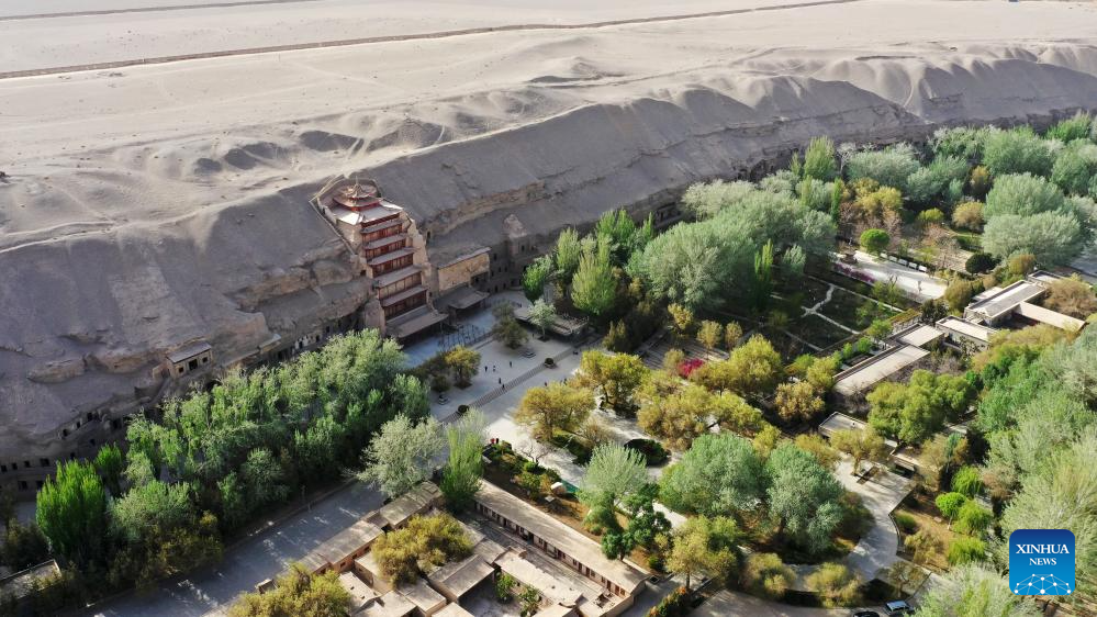 An aerial drone photo taken on April 25, 2023 shows the Mogao Caves in Dunhuang, northwest China's Gansu Province. Around 2,000 years ago, Dunhuang was a key hub on the ancient Silk Road. Chinese silk and tea passed through this gateway en route to other countries, while agricultural products such as grapes, carrots and pomegranates made their way into China.