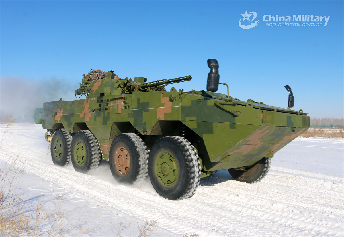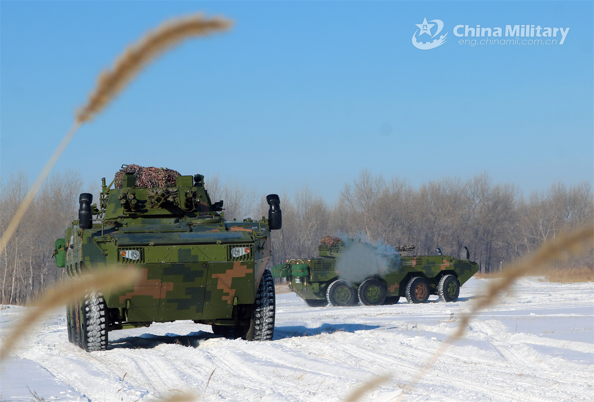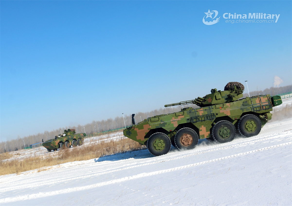 ZBL-08 Infantry Fighting Vehicles (IFVs) attached to a brigade under the Chinese PLA 78th Group Army tear through the snowy terrain during a driving training exercise on February 10, 2025. (eng.chinamil.com.cn/Photo by Zhang Yanjun)