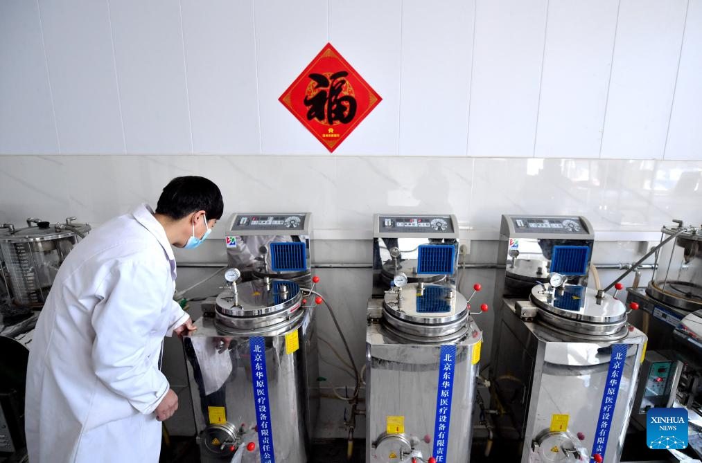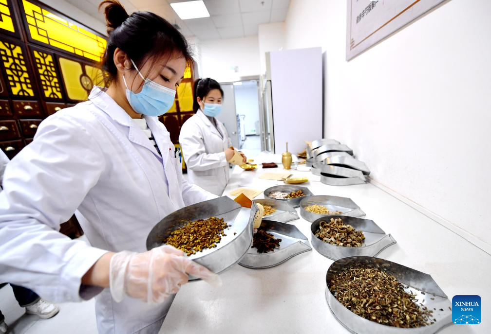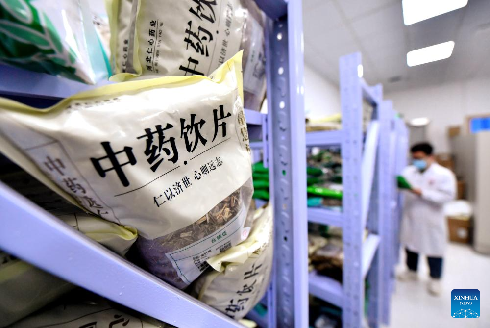 A staff member works at a traditional Chinese medicine (TCM) pharmacy in Shenzhou City, north China's Hebei Province, Feb. 19, 2025. Shenzhou City established a shared TCM pharmacy management system in September 2024 that integrates consultations from townships, online prescriptions, and intelligent herbal medicine decoction services with free delivery, enabling urban and rural residents to access high-quality TCM services conveniently. (Xinhua/Wang Xiao)