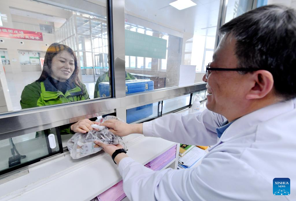A delivery worker picks up medicines from a traditional Chinese medicine (TCM) pharmacy in Shenzhou City, north China's Hebei Province, Feb. 19, 2025. Shenzhou City established a shared TCM pharmacy management system in September 2024 that integrates consultations from townships, online prescriptions, and intelligent herbal medicine decoction services with free delivery, enabling urban and rural residents to access high-quality TCM services conveniently. (Xinhua/Wang Xiao)