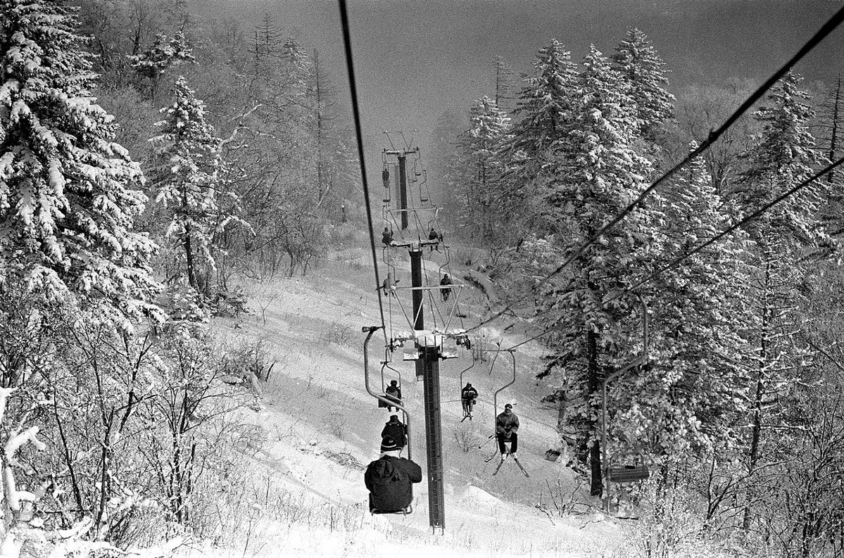 Athletes ride ski lifts to access the mountaintop at the ski resort on Jan 19, 1996. (Zhou Que/Xinhua)